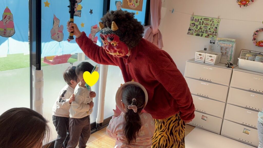 今日は節分ですね。節分は季節の変わり目に生じやすい病気や災害を払い、1年の健康と幸福を願う行事です。保育園にも鬼がやってきて鬼を見ると泣く子どもや一生懸命に豆を投げる子どもがいました。「おにはーそと」という声とともに力いっぱい投げて、無事に鬼退治をすることができました。その後福の神様がやってくると、嬉しそうにお菓子を拾ったりもらおうとする姿が見られました。皆さんの1年の無病息災を祈っています。